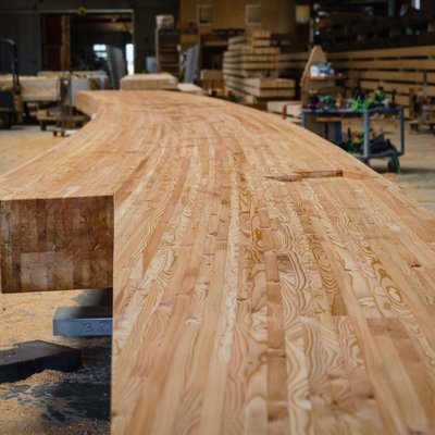 Das Tragwerk besteht aus gelenkig angeschlossenen Bogenträgern mit bis zu 57,5 m freier Stützweite. Es ist auf schrägen, bis zu 17 m langen Stahl-Rundstützen aufgelagert. Auf Kundenwunsch wurden die 1,80 m hohen Träger in Lärche geplant. Aufgrund der maximalen Transportlänge von ca. 50 m wurden gelenkige und biegesteife Stöße ausgeführt. Eine Herausforderung an die Bogenstützen war der Innenradius von 7,50 m, was mit dem Werkstoff Holz jedoch produktionstechnisch gelöst werden konnte.
