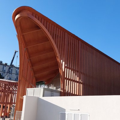WIEHAG hat in enger Zusammenarbeit mit den Architekten Tye Farrow die Statik berechnet und die Konstruktionspläne entwickelt. Rund 330 m³ Brettschichtholz aus Lärche, teils doppelt gekrümmt, wurden im Werk in Altheim produziert und maschinell abgebunden. Die BSH-Struktur für den Innen-, wie auch Außenbereich verleiht dem Gebäude die markanten Flügel aus Lärchenholz.
