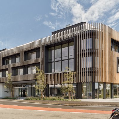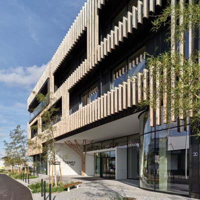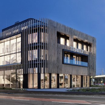 Mit einer Gesamtnettofläche von 6.100 Quadratmetern auf vier Ebenen kann sich der Plan für die neue TEAM 7 Welt sehen lassen. Eine Besonderheit des Gebäudes ist die spezielle Skelettbauweise. Diese ermöglicht auch eine besonders flexible Fassadengestaltung. Straßenseitig wurden senkrechte Sonnenschutzlamellen aus unbehandelter Eiche installiert. Die insgesamt 6.000 Festmeter Rundholz stammen zum Teil aus dem eigenen Firmenwald von TEAM 7.