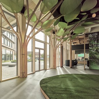 In der neuen TEAM 7 Welt entstanden nicht nur moderne Open-Space-Arbeitsplätze. Mit der bisher größten Investition in der Firmengeschichte möchte TEAM 7 die Kraft der Marke stärken. Im 1.200 Quadratmeter großen Store können sich Kunden von den natürlichen Wohnwelten des Möbelherstellers inspirieren lassen. Highlights sind ein Bio-Restaurant für Mitarbeiter und Gäste, eine vermietbare Showküche, eine Skybar mit Blick über Ried und eine Dachterrasse.