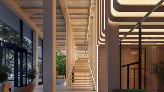 Das Bürohaus Timber Pioneer vereint eine nachhaltige Bauweise mit einem smarten Office-Konzept. Eine flexible Raumaufteilung ermöglicht die Kombination aus offenen Arbeitslandschaften, Rückzugsorten und bequemen Meeting Zonen.