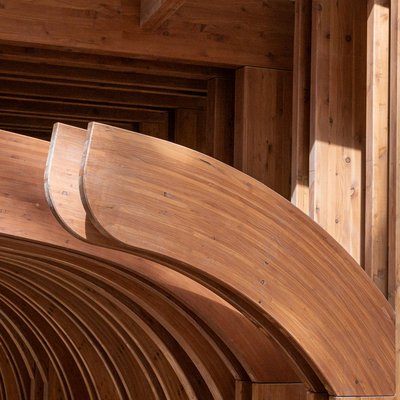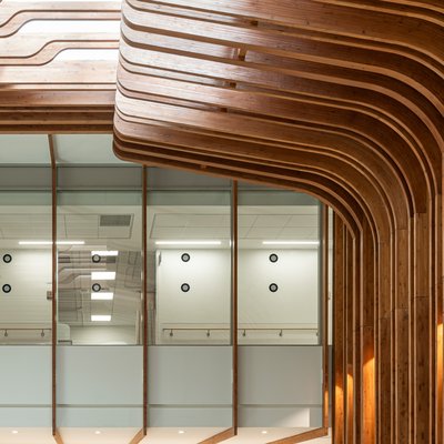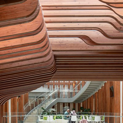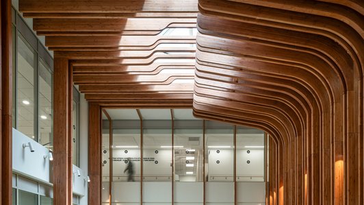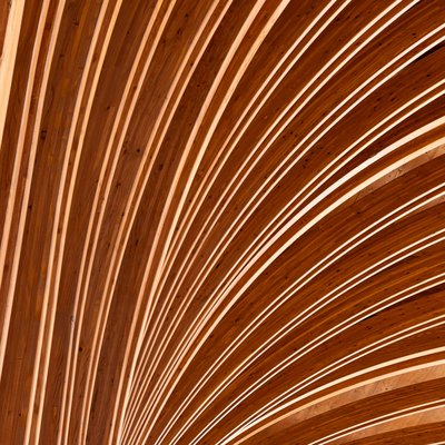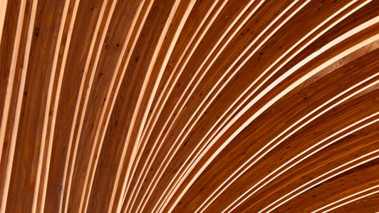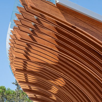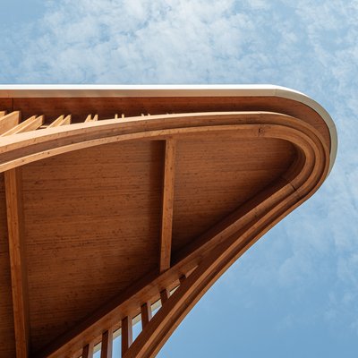 WIEHAG hat in enger Zusammenarbeit mit den Architekten Tye Farrow die Statik berechnet und die Konstruktionspläne entwickelt. Rund 330 m³ Brettschichtholz aus Lärche, teils doppelt gekrümmt, wurden im Werk in Altheim produziert und maschinell abgebunden. Die BSH-Struktur für den Innen-, wie auch Außenbereich verleiht dem Gebäude die markanten Flügel aus Lärchenholz.