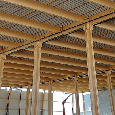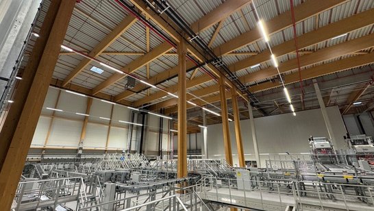 For the tallest section of the facility, reaching heights of up to 36 metres, a detailed erection concept was developed and precisely executed by WIEHAG’s experienced installation team. Special attention was paid to the temporary bracing of the glulam columns — carried out under controlled, low-wind conditions to guarantee safe assembly throughout the process.