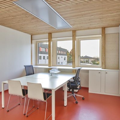 As a sustainable building in passive house standard, the existing former Telekom building was extended by a new building arranged perpendicular to it and a 2nd floor was added. The existing building was additionally refurbished in terms of energy efficiency. All new additions are made of timber frame construction with a view to special sustainability. The building's electricity needs can be largely covered by the PV system on the roofs. The entire facility was constructed as a two-storey, partly three-storey timber building.